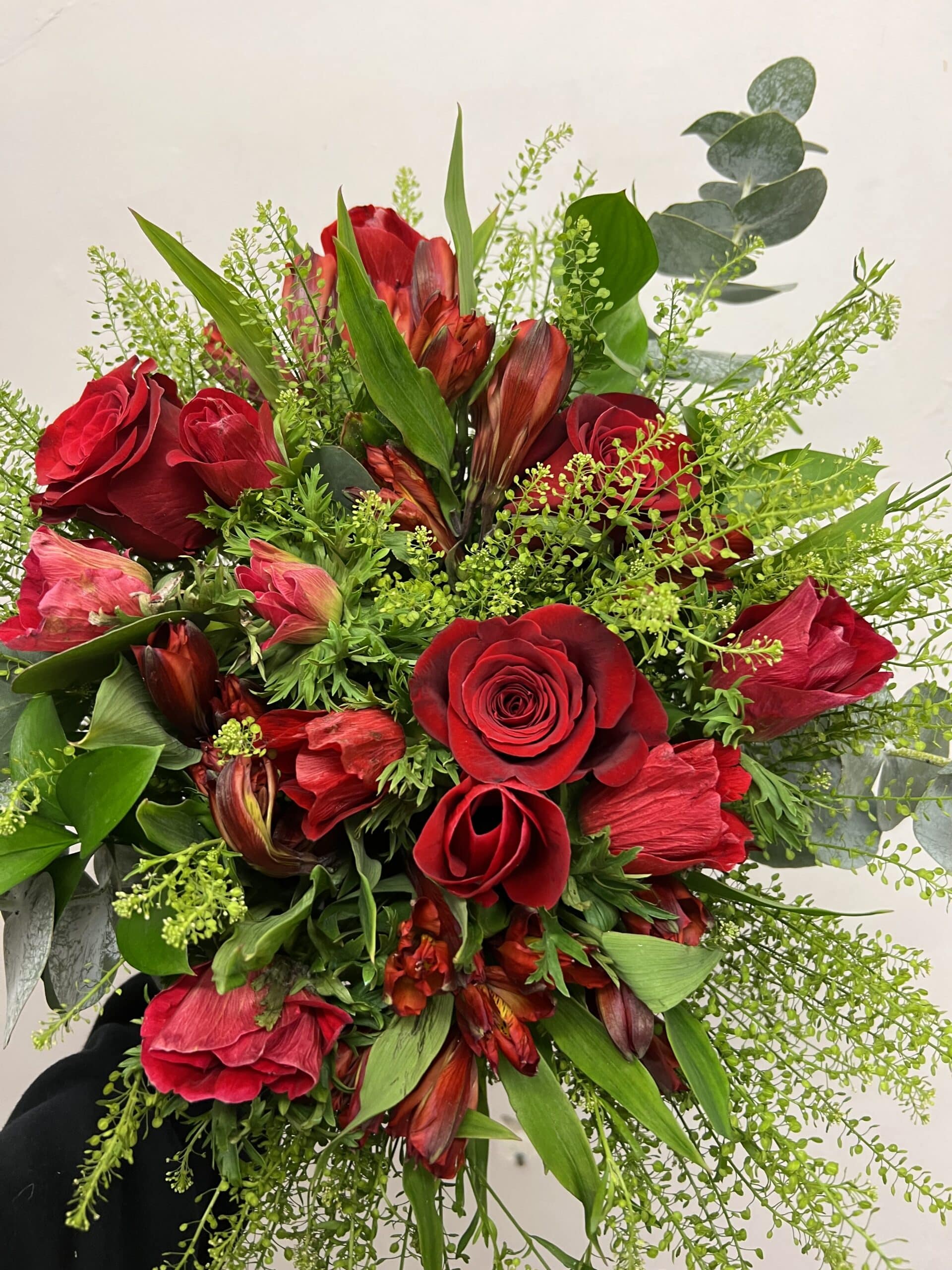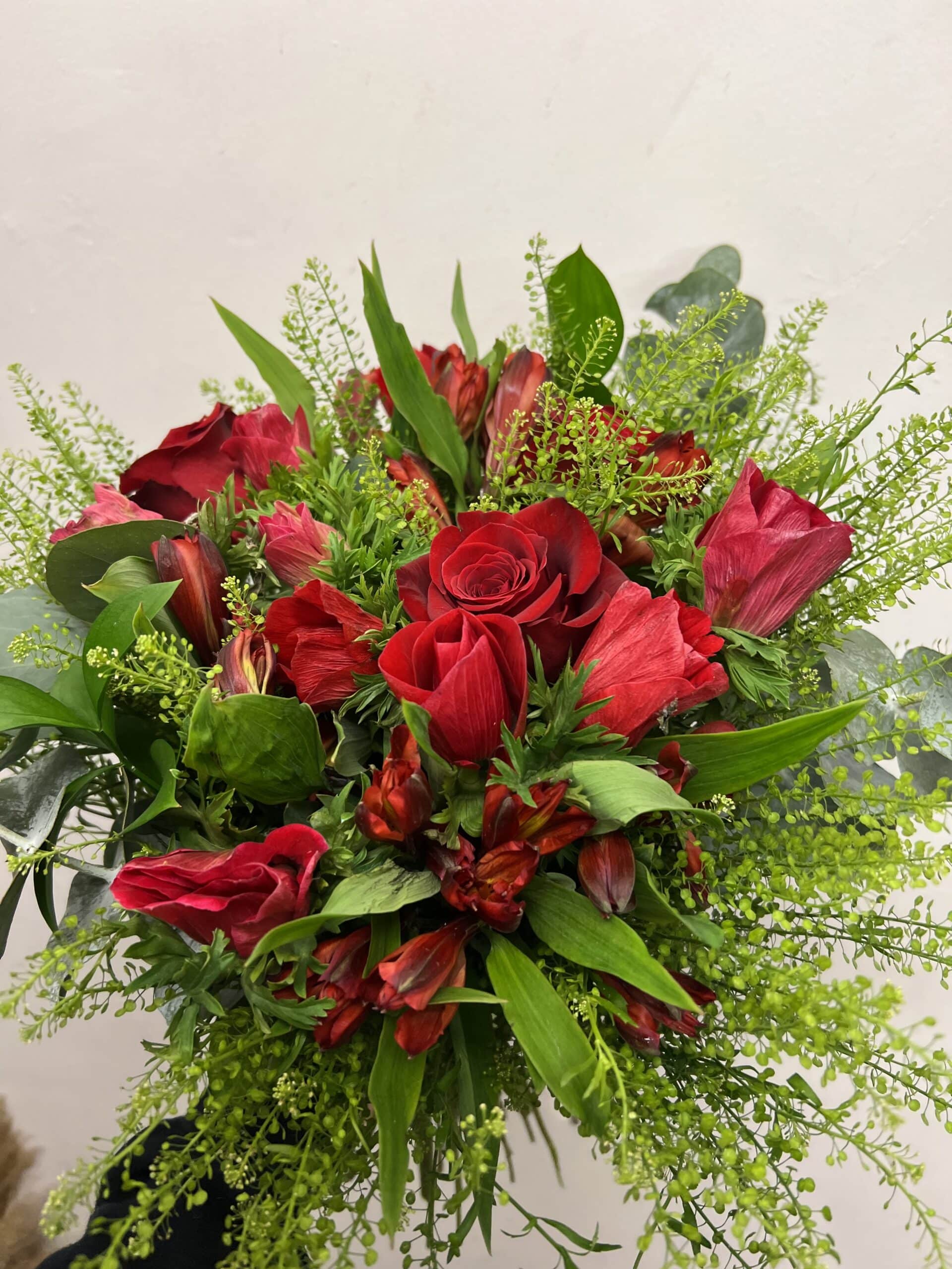 Composé uniquement de fleurs rouges Notre fleuriste fera une création suivant le choix de fleurs et sa créativité.
